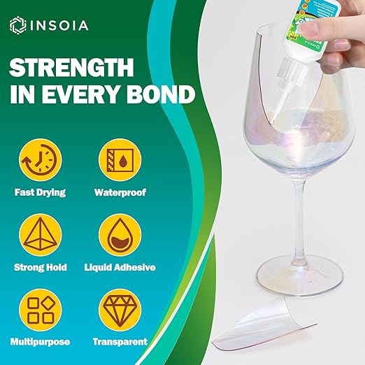 • ?§Š?�Super Glass Glue?‘INSOIA crystal clear Glass Glue is engineered with a professional-grade formula that creates super-strong, invisible bonds for glass-to-glass repairs and other materials. It adheres seamlessly to surfaces without becoming brittle or losing strength over time. Whether you're repairing broken glassware, vases, mirrors, or decorative items, this glue ensures a durable and reliable hold, making it perfect for both household and professional repairs.