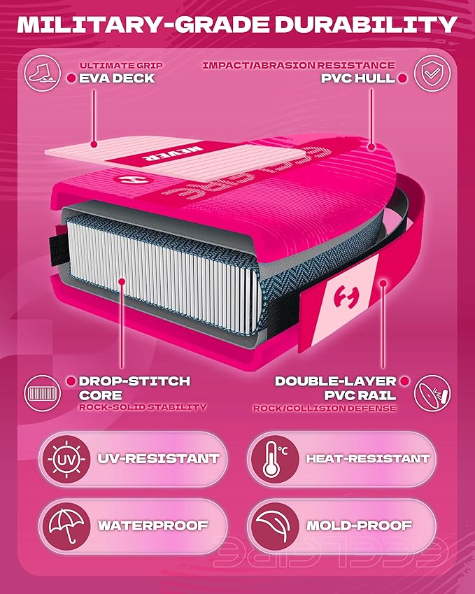 • 【𝗠𝗶𝗹𝗶𝘁𝗮𝗿𝘆-𝗚𝗿𝗮𝗱𝗲 𝗣𝗩𝗖 𝗮𝗻𝗱 𝗡𝗼𝗻𝘀𝗹𝗶𝗽 𝗘𝗩𝗔 𝗳𝗼𝗿 𝗟𝗼𝗻𝗴-𝗟𝗮𝘀𝘁𝗶𝗻𝗴 𝗣𝗲𝗿𝗳𝗼𝗿𝗺𝗮𝗻𝗰𝗲】 Featured with military-grade PVC and advanced drop-stitch, the Feelfire paddleboard is built for rugged conditions. Such as rocky rivers or exposure to saltwater and sunlight. The EVA diamond-patterned surface enhances foot traction and quick drainage, reducing slip risk. This design helps paddlers easily adjust their stance and center of gravity in windy or wavy conditions.