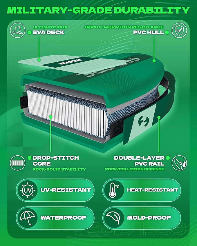 • 【𝗠𝗶𝗹𝗶𝘁𝗮𝗿𝘆-𝗚𝗿𝗮𝗱𝗲 𝗣𝗩𝗖 𝗮𝗻𝗱 𝗡𝗼𝗻𝘀𝗹𝗶𝗽 𝗘𝗩𝗔 𝗳𝗼𝗿 𝗟𝗼𝗻𝗴-𝗟𝗮𝘀𝘁𝗶𝗻𝗴 𝗣𝗲𝗿𝗳𝗼𝗿𝗺𝗮𝗻𝗰𝗲】 Featured with military-grade PVC and advanced drop-stitch, the Feelfire paddleboard is built for rugged conditions. Such as rocky rivers or exposure to saltwater and sunlight. The EVA diamond-patterned surface enhances foot traction and quick drainage, reducing slip risk. This design helps paddlers easily adjust their stance and center of gravity in windy or wavy conditions.