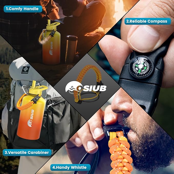 • Nighttime Navigation: Not only does the paracord handle securely grip your insulated water bottle, but it also boasts a glow-in-the-dark feature. Complete with a compass and carabiner, this multifunctional paracord handle is an essential companion for your camping or hiking adventures.
