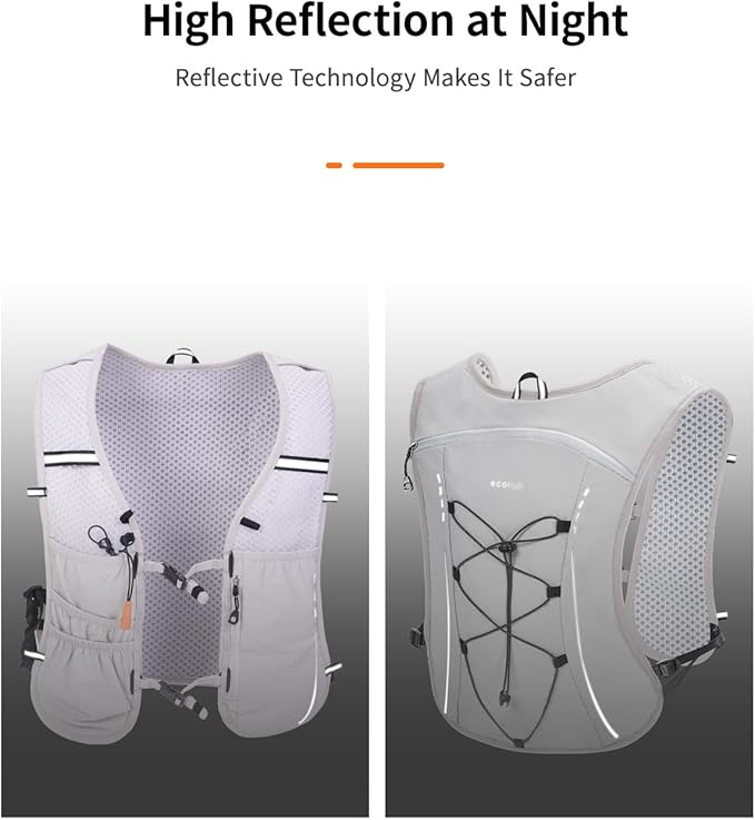 • 【Breathable and Ergonomic Design】 Ecohub running hydration vest engineered with 3D contour stitching that follows spinal curvature, reduces vest shift and bouncing during runs. The breathable rhombic ventilated mesh design keeps your back cool by maintaining air circulation, preventing discomfort due to accumulated heat. (PATENT PENDING)