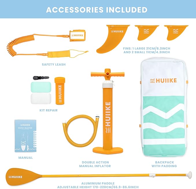 • All the accessories you need - The “Enjoyer - Essential” collection include everything necessary to practise paddleboarding: green stand up paddle board, backpack, safety leash, pump, aluminum paddle, 3 fins, repair kit and manual