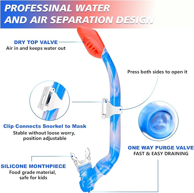 • 【Thickened Tempered Glass Lens】- The Diving Goggles are made of 4.0mm HD tempered glass lens, which is much more thicker and durable than other 3.2mm lens. It is impact resistant and explosion-proof, clear and safe. Dry-top snorkels have a mechanism that prevents water from entering the tube when submerged, making them a good choice for beginners
