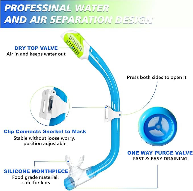 • 【Thickened Tempered Glass Lens】- The Diving Goggles are made of 4.0mm HD tempered glass lens, which is much more thicker and durable than other 3.2mm lens. It is impact resistant and explosion-proof, clear and safe. Dry-top snorkels have a mechanism that prevents water from entering the tube when submerged, making them a good choice for beginners