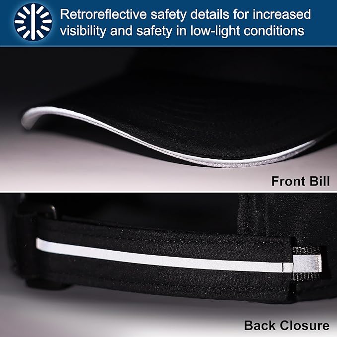 • Enhanced Visibility: Designed with a sandwich-style reflective front brim and reflective-trimmed back closure, this sports cap enhances visibility in low-light conditions, ensuring runners remain visible and secure