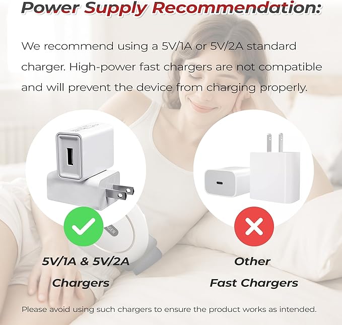 • 【Power Supply Recommendation】We strongly recommend using a 5V/1A or 5V/2A standard charger. High-power fast chargers are not compatible and will prevent the device from charging properly. Please avoid using such chargers to ensure the product works as intended.