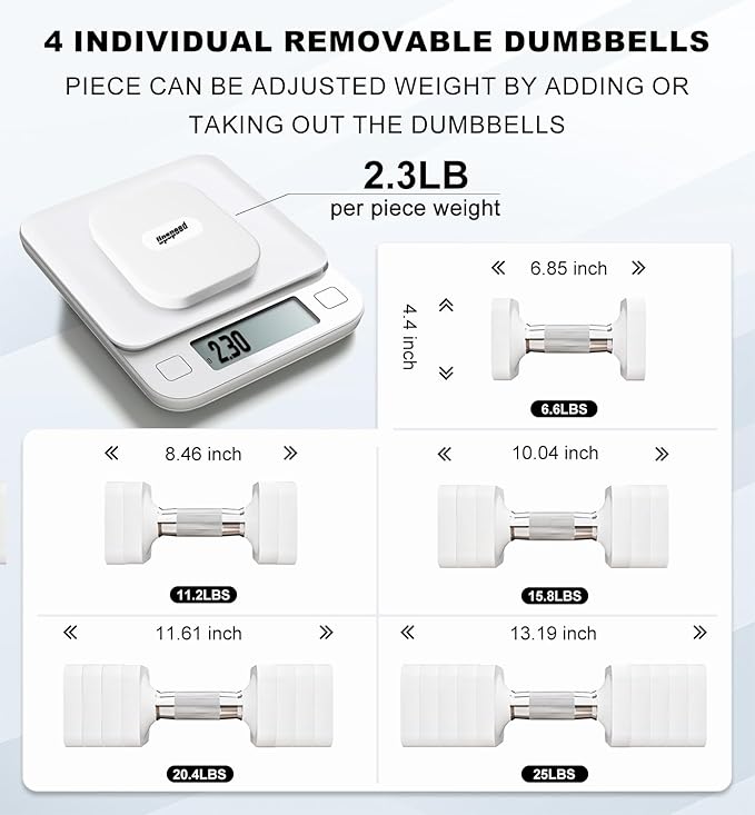 • 5 in 1 Adjustable Hand weights dumbbells set for men women. Our dumbbell sets consists of 10 weight dumbbell plate, adjustable range is 6.6lb, 11.2lb, 15.8lb, 20.4lb, 25lb each weight (A Pair 13.2lbs 22.4lbs 31.6lbs 40.8lbs 50lbs).