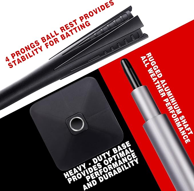 • 3-Section Shaft: The baseball tee height adjusts from 23-44 inches , Consisting of 2 sections of structurally sound aluminum alloy and 1 section of impact-resistant nylon rodsit.Whether it's young beginners or more advanced athletes, it meets different training needs.