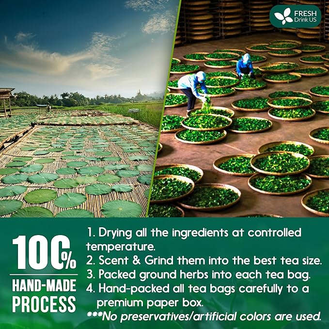 • ☘️ HAND-MADE PRODUCING PROCESSES, NO ADDITIVES: Our Lotus Green tea is processed in a hygienic environment. The tea bags are individually wrapped for freshness and convenience, maintain the herb's freshness and aroma, ensure the safety of customers and quality of products. Sugar-Free, Gluten Free, Vegan, No Artificial Flavors, No Colors Added.