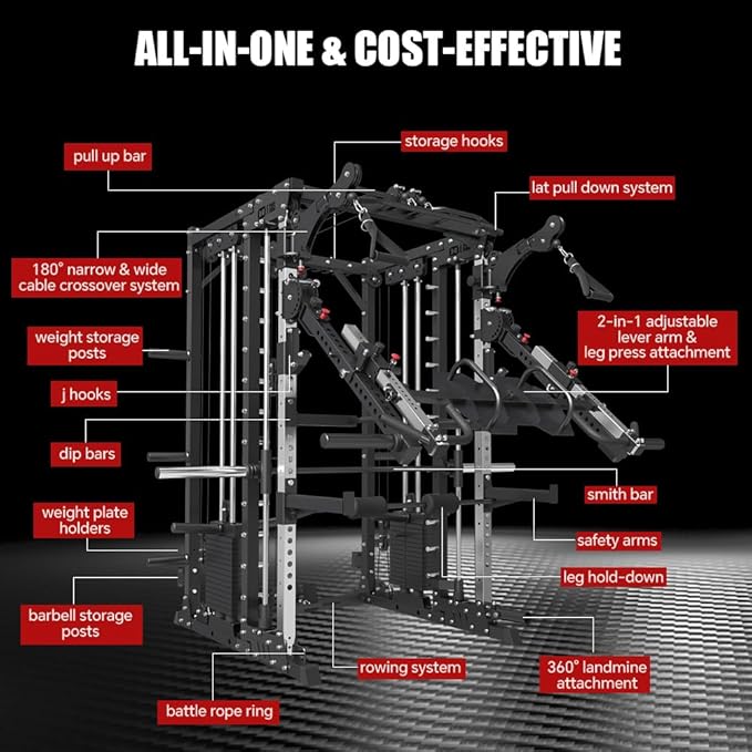 • All in One Power Cage Home Gym Station: This home gym workout station is multi-functional with full body training attachments which is perfect for home and commercial gym. This all in one power cage comes with functions of power rack, narrow and wide cable crossover, smithe machine, lat pull down, dipping, vertical leg press, lever arm, pull up, seated row, chin up, battle rope, landmine, leg raise and so on. You are able to perform full body training workouts in a limited space.