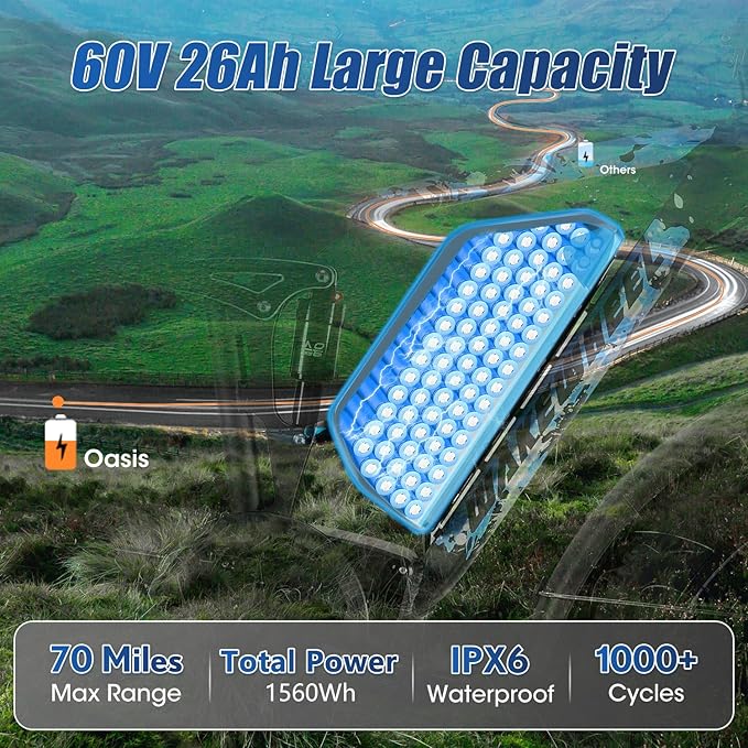 • 60V 26AH High Capacity Battery:Oasis e-bike has higher capacity battery with longer battery life,is capable of traveling longer distances. Lasts up to 40 miles on a single charge on pure electric power and up to 80 miles on pedal assist. TWO CHARGING OPTIONS: you can charge it on the bike or remove the battery to charge it, reducing the risk of theft. IPX6 WATERPROOF, you can ride in rainy weather with confidence. Intelligent BMS keeps the battery safe and power-saving