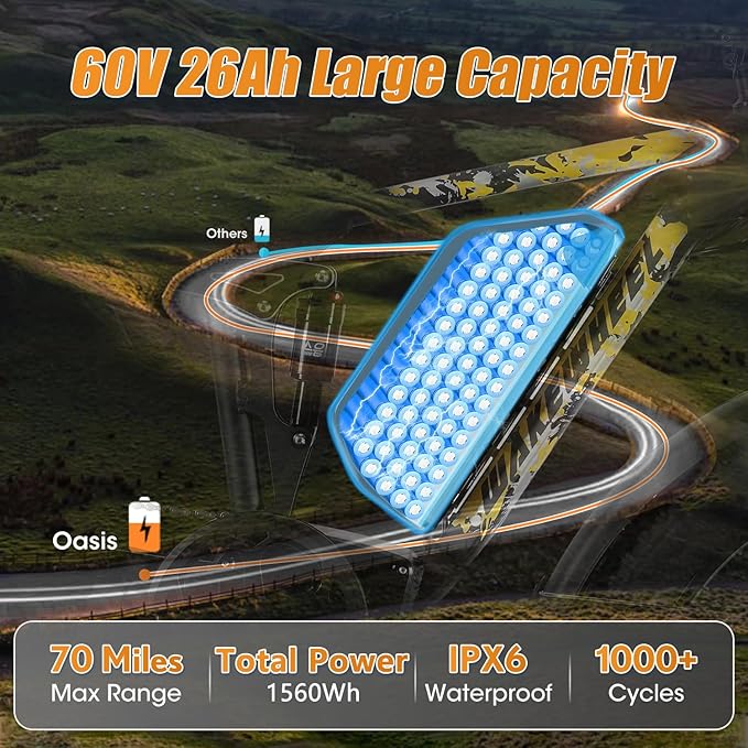 • 60V 26AH High Capacity Battery:Oasis e-bike has higher capacity battery with longer battery life,is capable of traveling longer distances. Lasts up to 40 miles on a single charge on pure electric power and up to 80 miles on pedal assist. TWO CHARGING OPTIONS: you can charge it on the bike or remove the battery to charge it, reducing the risk of theft. IPX6 WATERPROOF, you can ride in rainy weather with confidence. Intelligent BMS keeps the battery safe and power-saving