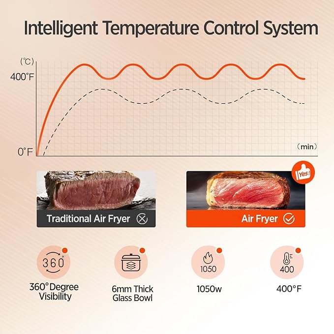 • 🌪️ Even Heat for Consistent Cooking: Engineered with a 360° hot air circulation system, this air fryer ensures that heat is evenly distributed around the glass bowl. This innovative design helps cook food uniformly, delivering delicious results with every use.