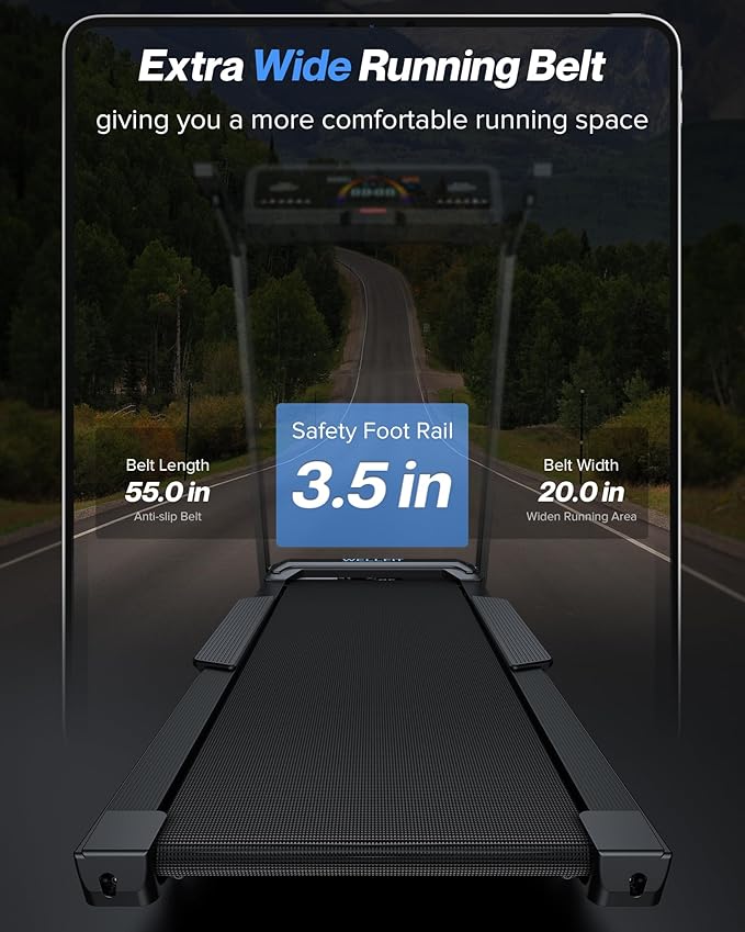 • Ultra Large Running Area: 55" x 20" running belt offers big enough space while you run, fitting all sizes of users' stride lengths. 3.5 inch widen safety foot rails. The treadmill is equipped with 5 layers of non-slip running belt, 8 shock absorbers, deck cushioning protects your knee and joints.