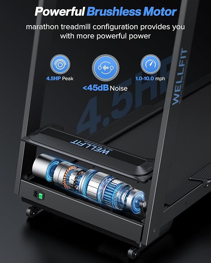 • 4.5HP Powerful & Quiet Brushless Motor: Brushless motor with max 4.5 HP provides efficient and low-maintenance operation. The treadmill supports up to 500 lbs and speeds from 1.0 to 10 MPH, perfect for everything from leisurely walks to intense runs, all while maintaining a under 45 dB low noise level.