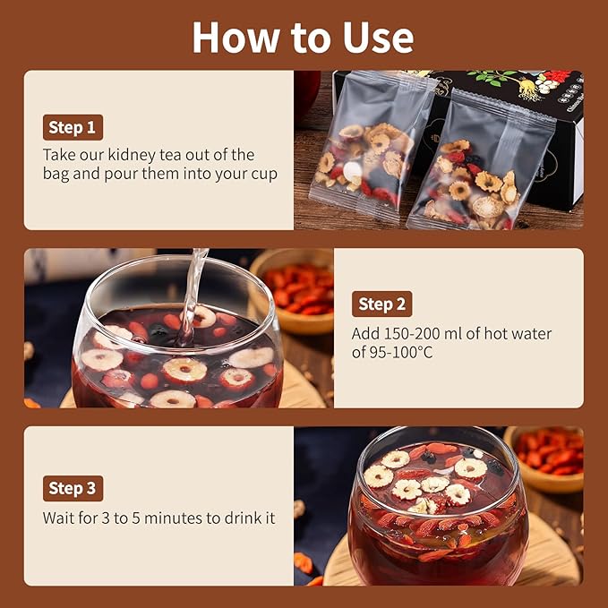 • NATURAL HERBAL FORMULA: Our te renal herbal use carefully selected ginseng, wolfberry, yam, red dates, huang jing, mulberry, maca as raw materials, after scientific proportioning, natural drying, natural formula, without any additives, you can eat the ingredients with peace of mind