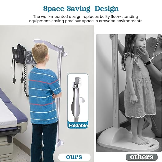 • Extra-Wide Platform & Space-Saving Design – Features a 15” x 12” wide platform for enhanced stability and safety, while the foldable, wall-mounted stadiometer maximizes space, perfect for clinics, gyms, and homes with limited room