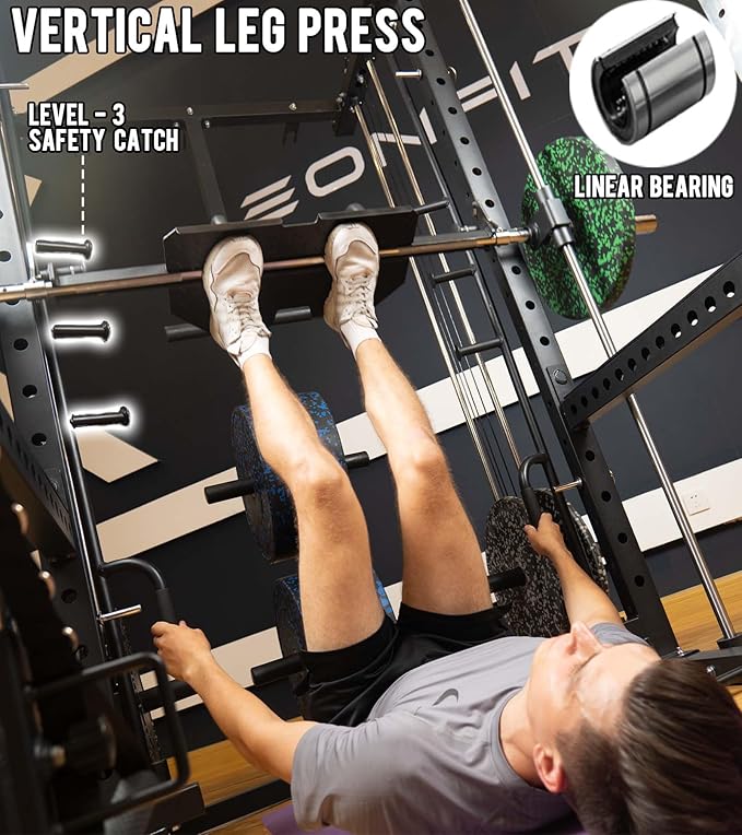 • 【11-In-1 Home Gym Station】E5 smith machine combines Power Cage/Functional Trainer/Cable Crossover/Two Lat Pull down Station/ Smith Machine /Vertical Leg Press/Chin Station /Dip Station /Core trainer/Landmine Station /Suspension Trainer. The guide rails (premium solid steel) deliver ultra-smooth movement with bearings during the workouts, as well as safe lock and release mechanics and safety arms allowing the users to max out their training safely