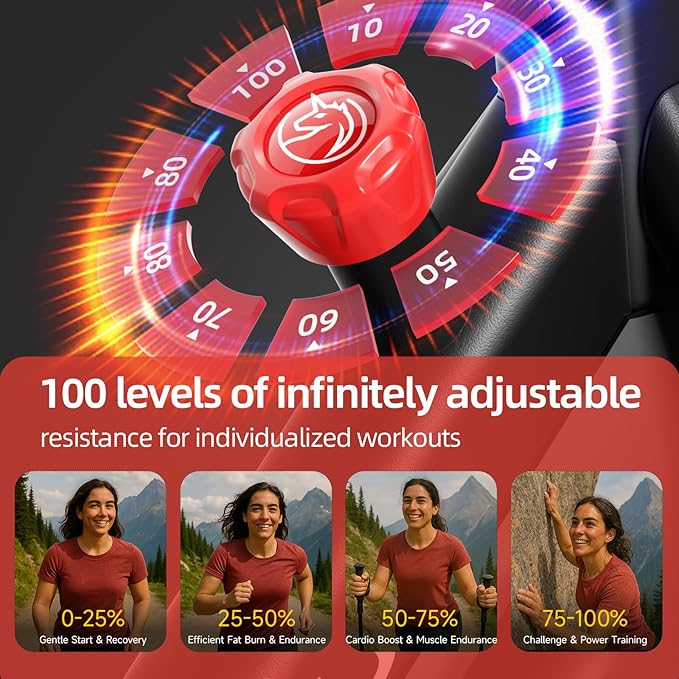 • Smooth & Silent Magnetic Resistance with 100 Levels: Experience ultra-quiet, smooth rides thanks to the advanced magnetic resistance system. Adjust across 100 levels to perfectly match your warm-up, HIIT, or recovery training needs.