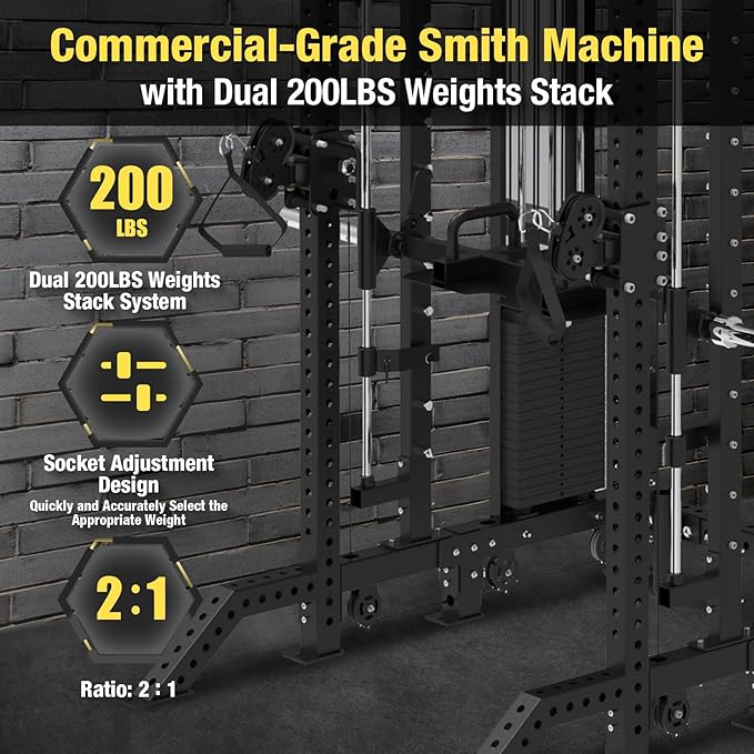 • Smooth & Precise Pulley System: The Smith Machine features a high-quality pulley system with dual 200lb weight stacks and a 2:1 pulley ratio, reducing strain while maximizing resistance. With adjustable positions, the cable system offers smooth motion and extended travel, ensuring a seamless experience for exercises like bicep curls, triceps pushdowns, chest presses, and more