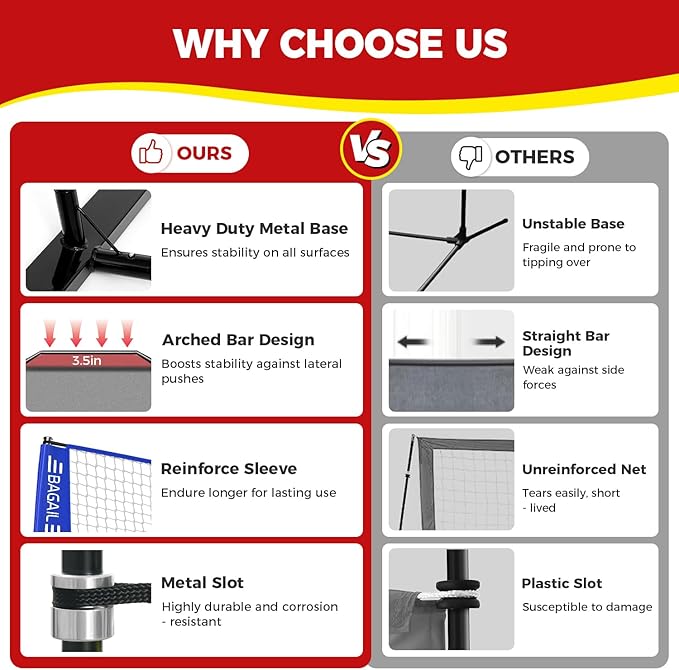 • Professional-Grade Stability: Our volleyball net features a heavy-duty square metal base for extra stability and anti-tip protection. The powder-coated steel frame resists rust in all weather. Its 5-ply net is tear-proof, withstanding powerful spikes. 16mm thick fiberglass poles endure intense uses, absorbing impacts to prevent damage, ensuring long-lasting performance
