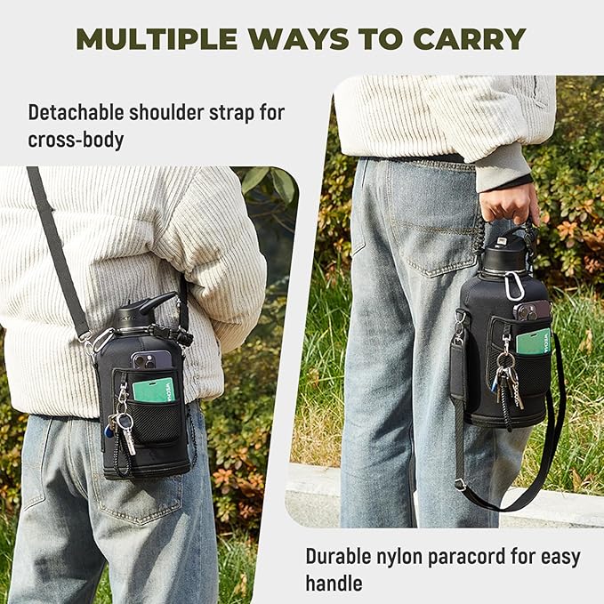 • What’s Included: When you purchase this half-gallon insulated water bottle, you’ll receive 9 premium accessories: Carrying Pouch with Shoulder Strap, Straw Lid with 2 Straws & Straw Brush,Spout Lid, Paracord Handle,Bottle Brush