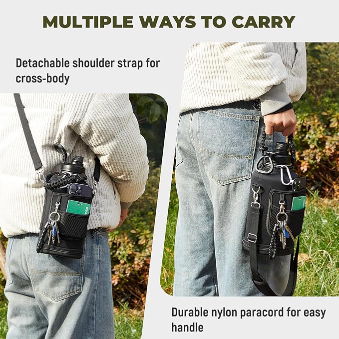 • Iconic Paracord Handle & Carrying Pouch Bottle: This water bottle comes with a hand-knit nylon paracord handle in a color that matches the bottle, making it a must-have for camping, hiking, or outdoor adventures. The included carrying pouch features a removable shoulder strap for hands-free convenience and a zippered pocket to securely store your phone, cards, keys, and other essentials