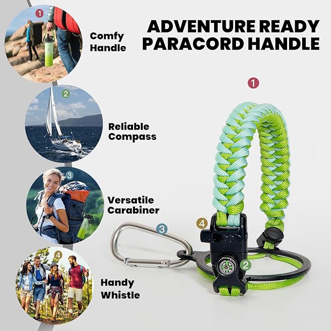 • Iconic Paracord Handle: This insulated water bottle comes with a beautiful hand knit nylon paracord in coordinated color with the water bottle. Configured with a compass and carabiner, this paracord handle is a must-have as a full functional camping / hiking flask