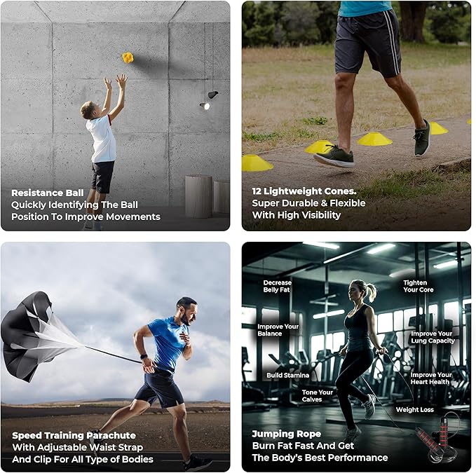 • "Agility Training Equipment Kit": Includes a 2 * 20ft agility ladders with 8 ground stakes, 4 agility hurdles, 12 vibrant yellow disc cones, and a high-resistance running parachute. Perfect for all skill levels—from beginners to pros—this set is built to elevate your speed, coordination, and overall athletic performance.