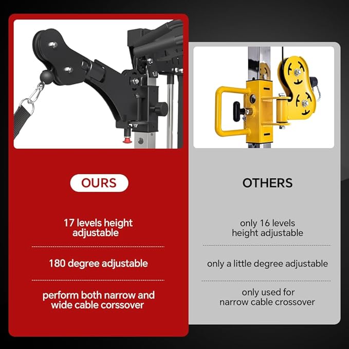 • 180° ROTATABLE CABLE CROSSOVER: Unlike others on the market, our cable crossover attachments on this machine adopts a specific patented design, which are 180 degree rotatable, allowing you to perform both narrow and wide cable crossover to build strength on different muscle groups. The 1:1 ratio lat pull down helps you to achieve a more efficient workout in daily strength training.
