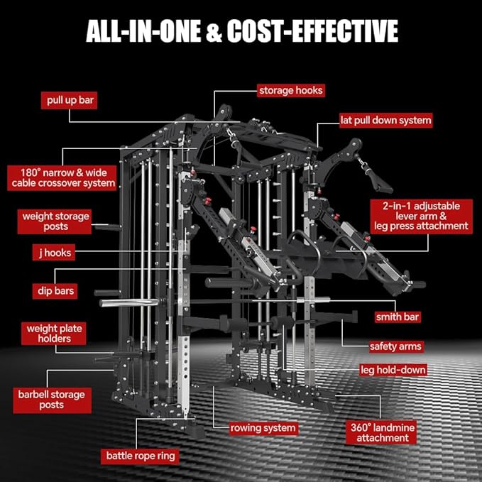 • ALL IN ONE POWER CAGE HOME GYM STATION: FAGUS H home gym workout station is multi-functional with full body training attachments which is perfect for home and commercial gym. This all in one power cage comes with functions of power rack, narrow and wide cable crossover, smith machine, lat pull down, dipping, vertical leg press, lever arm, pull up, seated row, chin up, battle rope, landmine, leg raise and so on. You are able to perform full body training workouts in a limited space.
