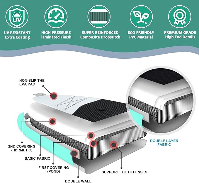 • 🛡️Military-Grade Durability & Safety: Built with 0.9mm reinforced PVC and dual-layer V-drop stitch technology, the blow up paddle board withstands sharp impacts and UV exposure. The 4mm cross-vertical EVA deck delivers exceptional anti-slip performance, even during high-intensity movements. Rated for 450 lbs, it retains structural integrity under heavy loads, making it ideal for fishing, yoga, or multi-hour expeditions.