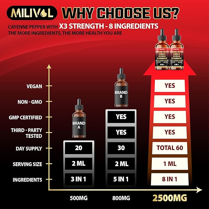 • ✔️ Easy to Use: 2 Packs of 30ml. Each Cayenne Pepper Extract Drops contains 30ml of liquid, providing a 30-day supply. Only 1ml per day, it’s simple to incorporate into your daily routine.