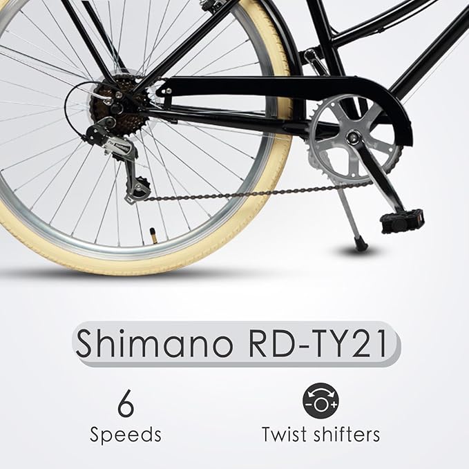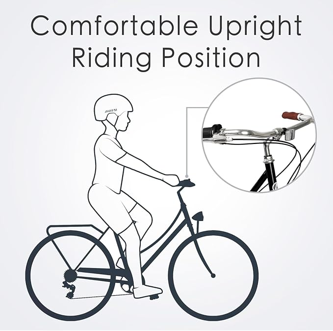• 🚴‍♀️【Women-Centric Ergonomic Design】Crafted for female proportions: A low-step high-carbon steel frame enables easy mounting, while the swept-back handlebars promote upright posture (reducing back strain). The brown synthetic leather saddle with shock-absorbing springs combines vintage aesthetics with modern comfort.