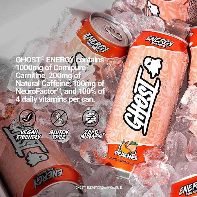 • Feel Good Energy: GHOST Energy is the fully transparent, fully loaded energy drink we’ve all been waiting for. Authentic Flavors. Zero Sugars.* No BS. Peaches flavor. 12-pack case contains 16oz cans. Only intended for persons 18 years or older. *GHOST Energy is low in calories.
