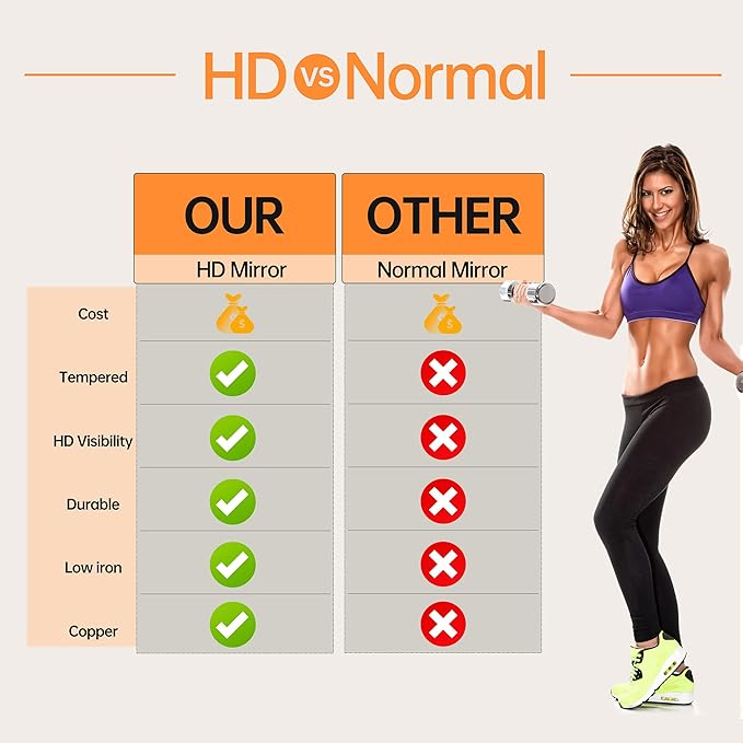 • HD CLEAR REFLECTION: This mirror is made of High Definition float glass for super clear reflection. Whether you're doing yoga, working out, or just checking your appearance, it can clearly reflect portraits and objects without any distortion, giving you the best view of yourself