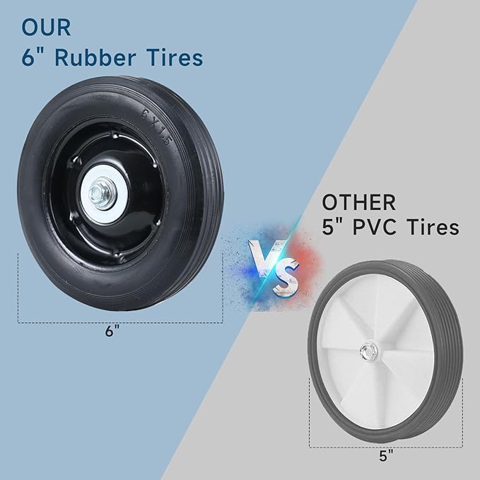 • 𝐀𝐥𝐥 𝐓𝐞𝐫𝐫𝐚𝐢𝐧 𝐑𝐮𝐛𝐛𝐞𝐫 𝐖𝐡𝐞𝐞𝐥𝐬 1.5" wide treaded rubber wheels provide 40% better grip on pavement/gravel/grass vs plastic/PVC competitors.