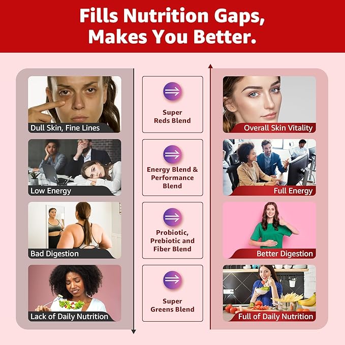 • Convenient, Nutrient-Rich Daily Support: Say goodbye to complex meal planning! Our superfoods gummies make it easy to consume essential nutrients. The Super Reds Blend delivers a powerful combination of fruits, greens, and key vitamins like Vitamin A, D3, and B12, which work together to boost cellular energy and overall wellness. Enjoy a simple, tasty way to stay on top of your health—get ready to feel amazing!