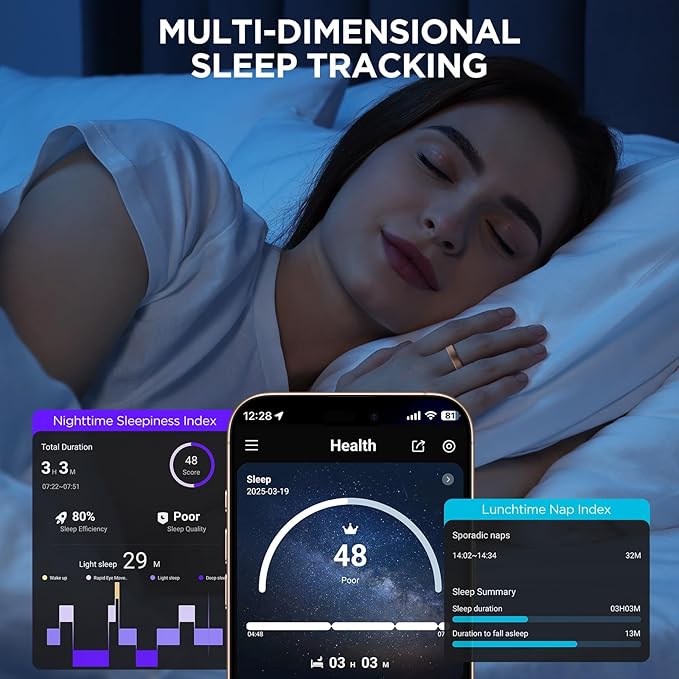 • Excellent Sleep Monitoring: This sleep tracker ring can automatically monitor your sleep (include night sleep and naps). Monitor the bedtime, wake-up time, eye movement time, sleep quality (deep sleep and light sleep). You can view detail sleep data in the app to help you better adjust your habits and improve sleep quality.