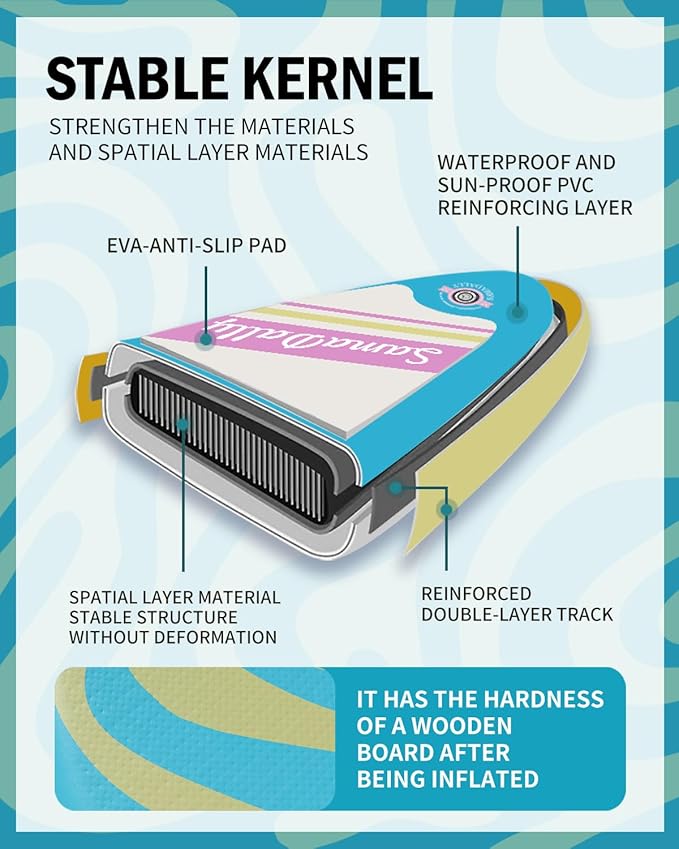 • Spacious & Enjoyable: SamaDally Candy Star series inflatable stand-up paddle boards are 1 to 2 inches wider than other similar products. 34in paddle surface is extremely spacious. Both beginners and paddleboards enthusiasts can find their own water - based fun on this SUP and enjoy a relaxing time.