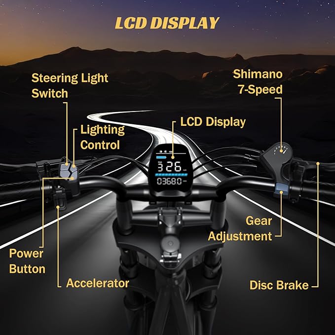 • Adaptive Riding Modes: Switch between pure electric, pedal-assist, or manual modes on this fat tire ebike. Shimano 7-speed gears and enhanced dual suspension (frame + seat) optimize comfort across city streets or mountain trails