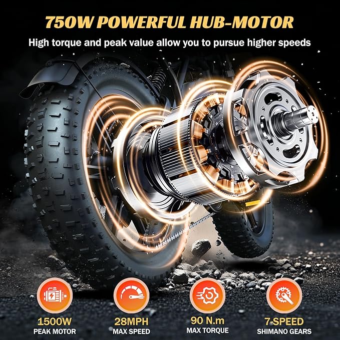 • High-Powered Performance: This electric bike for adults packs a 1500W peak motor with 90N.M torque, effortlessly conquering 35-degree slopes for true electric dirt bike adventures. The 20×4.0-inch fat tires provide superior traction on sand, mountains, or snow, while app-enabled speeds up to 28MPH deliver thrilling rides.The extended seat with integrated rear rack (50lb capacity) ensures comfort and utility on long journeys