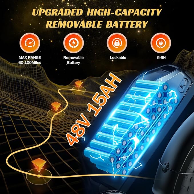 • Smart Battery System: Featuring a waterproof 48V/15AH removable battery, this adult electric bicycle delivers 50+ miles per charge with energy-saving tech. Recharges in 5 hours—perfect for commutes or off-grid explorations