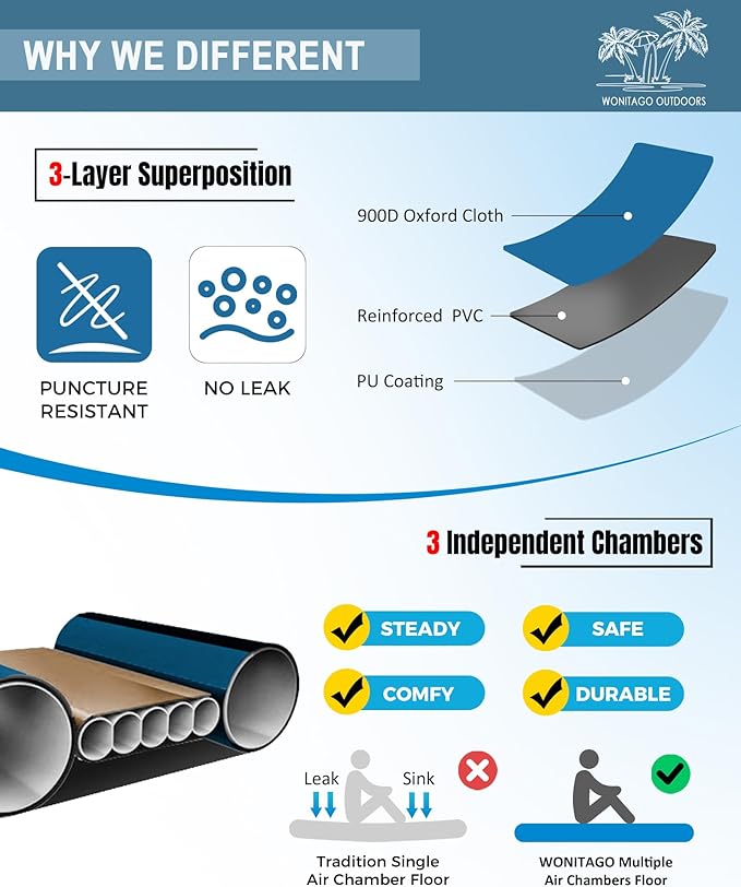 • ENJOY COMFORT JOURNEY --- This inflatable travel kayak's floor can provide comfortable support and flat surface, paired with our inflatable seat cushion, provides better support for your waist. It's ideal for excursion along the river to enjoy the scenery