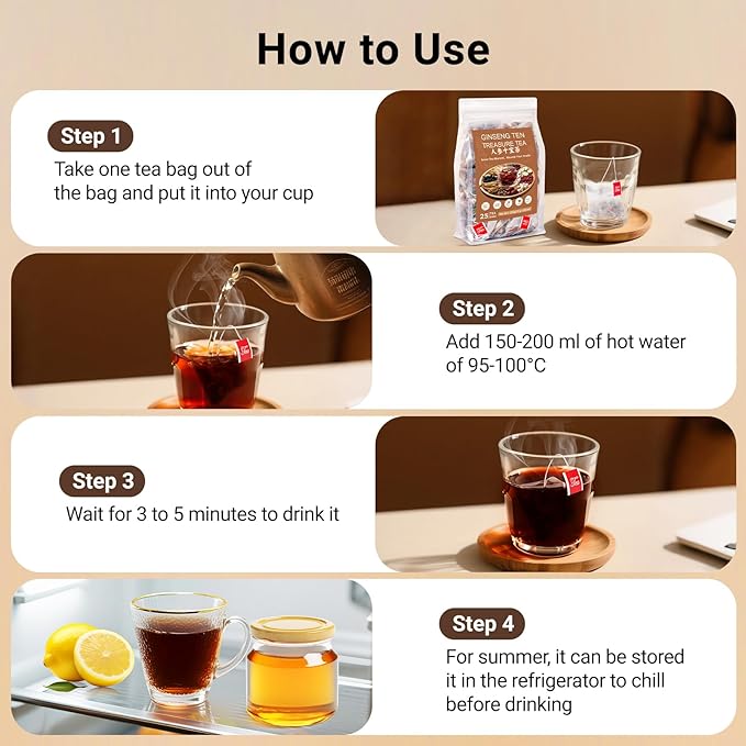 • SERVING AND STORAGE INSTRUCTION: Put one tea bag into your cup, add 150-200ml of hot water above 90°C, let it steep for 3 to 5 minutes, and it will be ready to drink. Our ginseng treasure tea can be brewed repeatedly 2 to 3 times. IN SUMMER, it can also be refrigerated for cold consumption and for opened but unbrewed tea bags, we recommend storing them in the refrigerator
