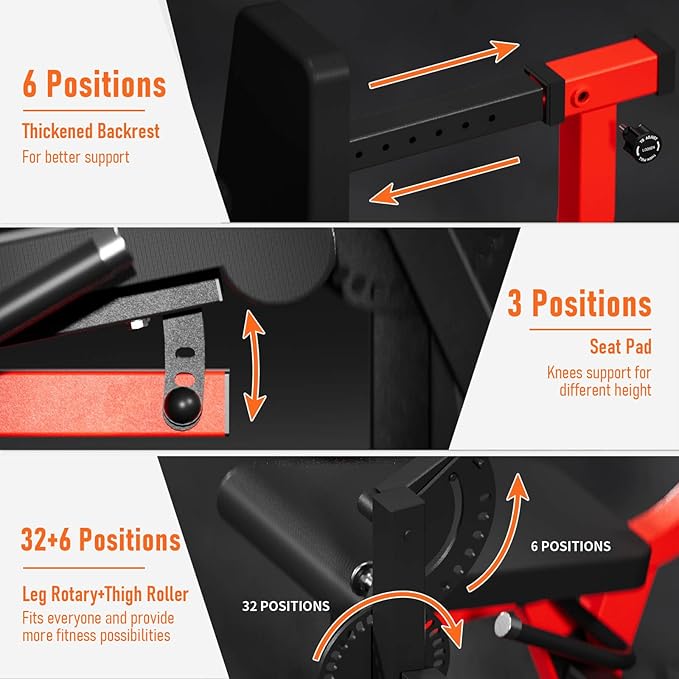 • 【Adjustability for Personalized Training】: 6+32+6+6+3+4 flexible position options for a customized home fitness experience. 6-position thigh holder, 32-position rotary leg extension, 6-position thickened backrest pad, 3-position seat pad and 4-position leg stop, 57 settings ensure all users a perfect fit and enhance your performance.