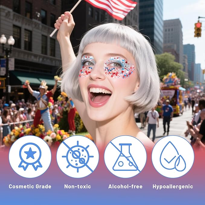 • Expressing Patriotic Feelings:Create the perfect finishing touch to your 4th of July outfit with this red white blue body glitter. Ideal for patriotic events, 4th of July celebrations, President's Day, international competitions, parades, the striking flag makeup expresses patriotism for your country.