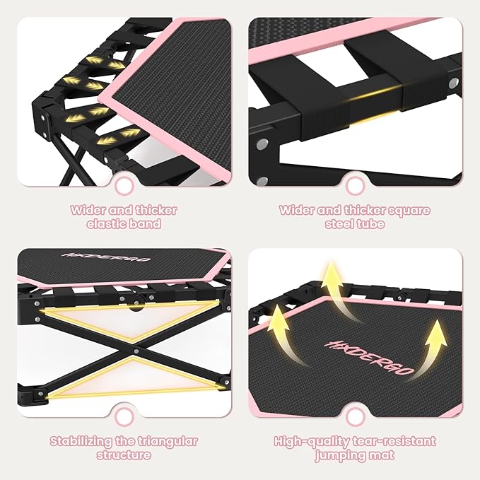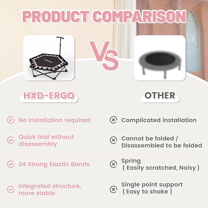 • Comfort & Stability: The HXD-ERGO Foldable Trampoline is designed for home use, featuring high-quality tear-resistant bouncy fabric and a stable hexagonal one-piece reinforced frame capable of supporting up to 460 pounds. It uses 24 durable elastic bands instead of springs, offering a safer and quieter experience— even if you step on the frame, it's less likely to cause injury. This fitness trampoline provides a more comfortable jumping experience.