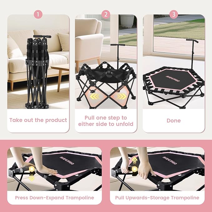 • No installation fitness trampoline, open it and use it immediately. Hexagonal folding quick design, quickly unfolds for storage.