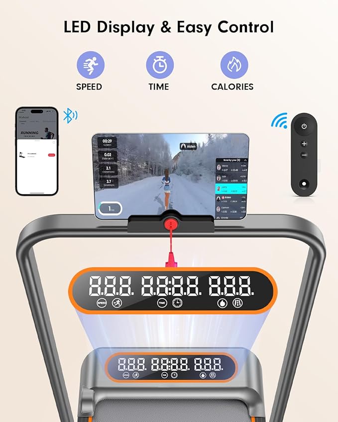 • Remote Control & LED Display: The LED screen and Fitness app display essential metrics like speed, calories burned, time and distance. App allows you to customize training plans and enjoy more social experience. With the remote control, you can adjust the speed for your desired fitness modes at any time, which make your exercise more convenient and simple.